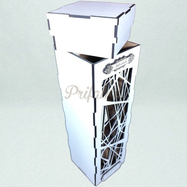 Caja especial para botella de vino, fabricada en MDF de 3 mm en terminación natural o blanca.